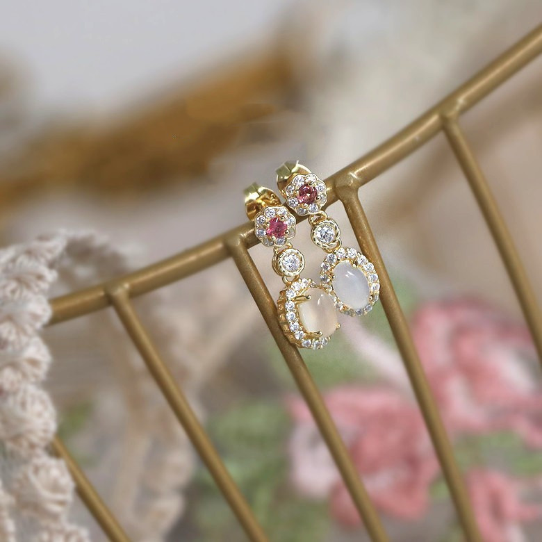 小众设计天然樱花粉碧玺白玉髓耳环耳坠 银镀金 复古少女款耳钉