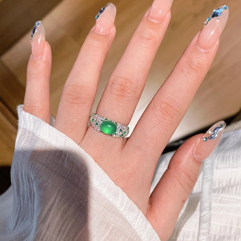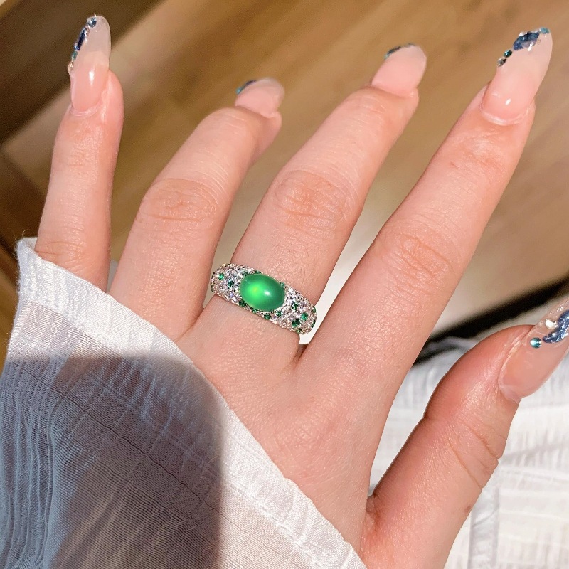 Light luxury high-end medieval full diamond green chalcedony egg shaped ring with personalized design, retro exquisite full diamond noble index finger ring