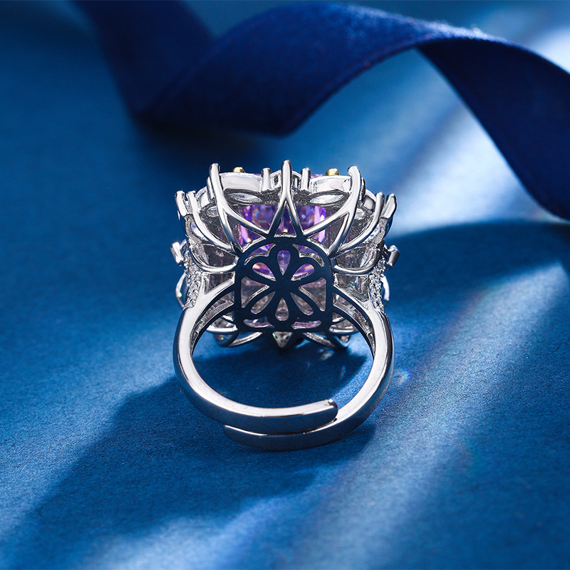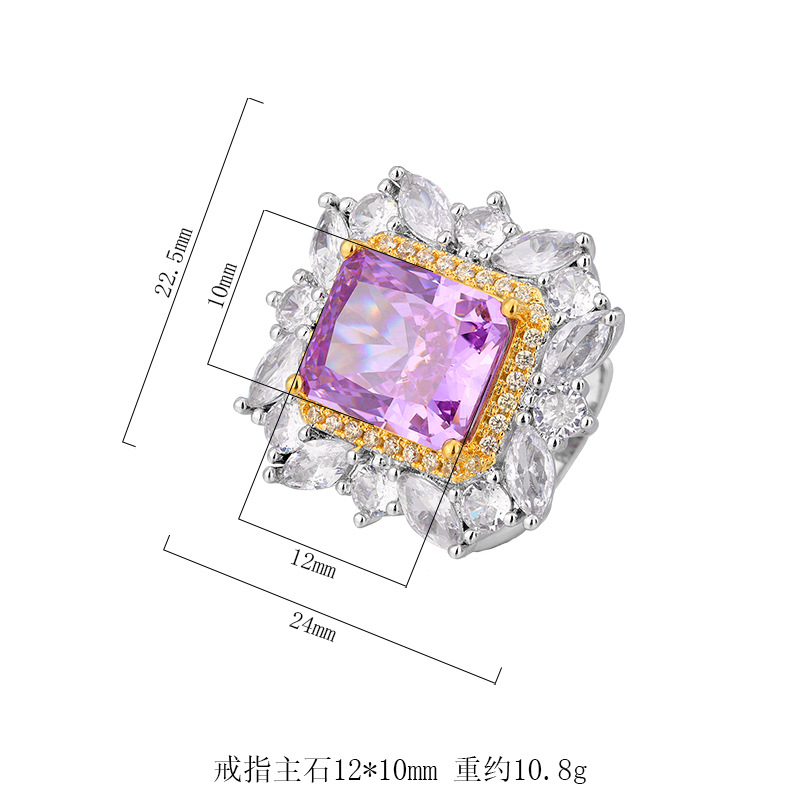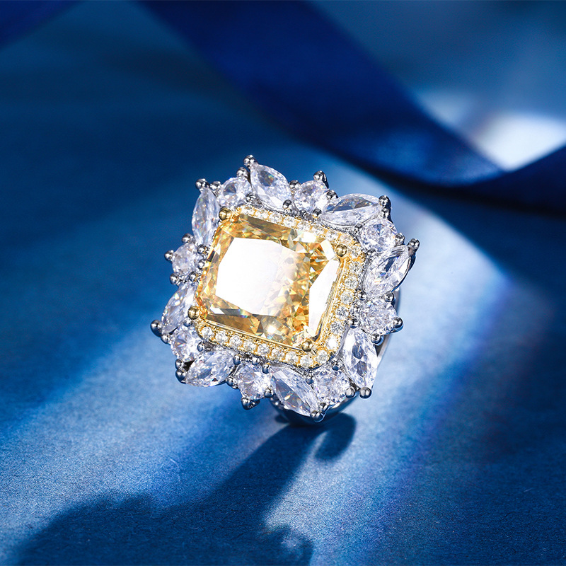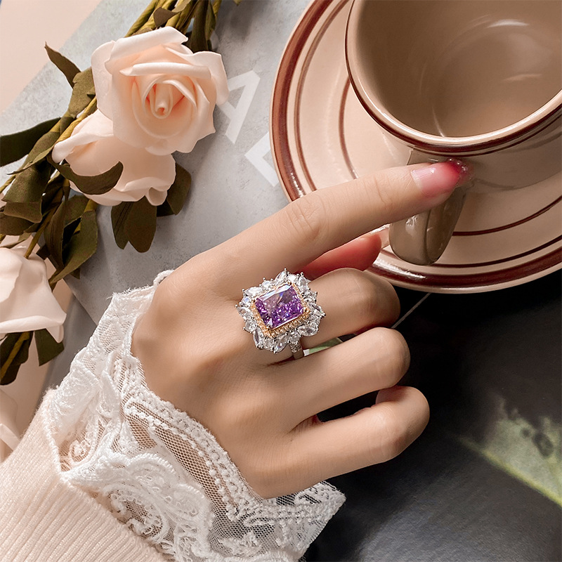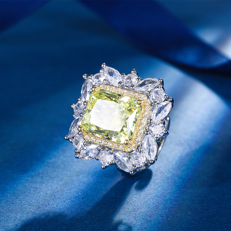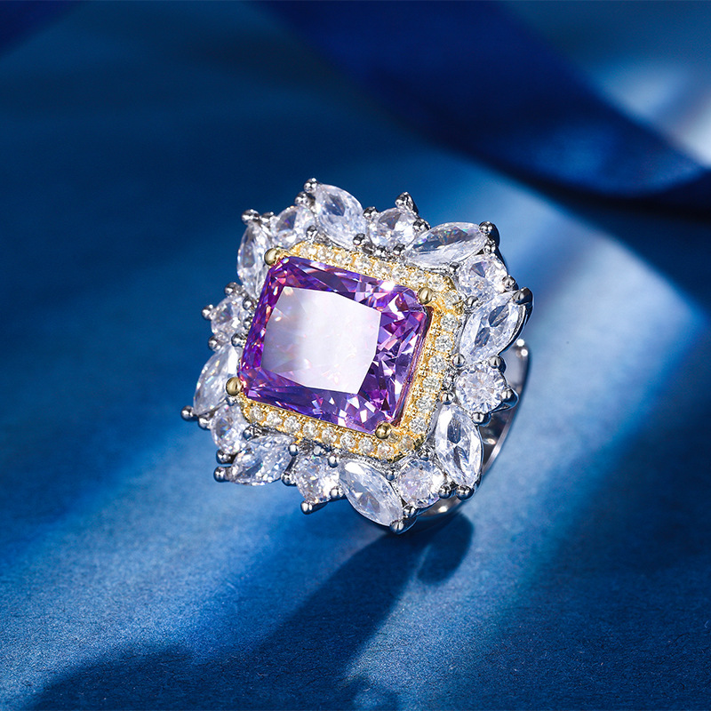 Home Ring The cutting technology of colored gemstones is popular, with high carbon content, and the main component carbon element is the same as that of real diamonds. Highly simulated diamond Redion cut high-end texture ice flower cut color diamond copper inlaid fashionable light luxury ring 10 * 12