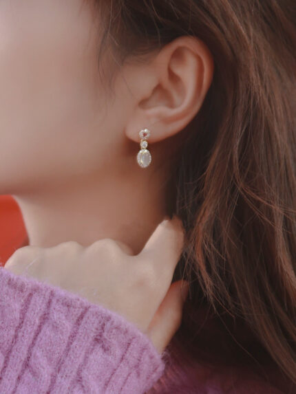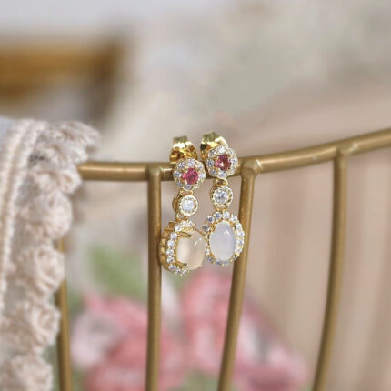 小众设计天然樱花粉碧玺白玉髓耳环耳坠 银镀金 复古少女款耳钉