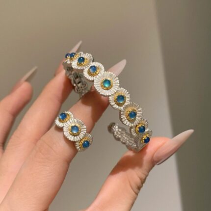 Vintage法式复古蓝色玉髓小雏菊戒指小众设计精致百搭中古风手饰